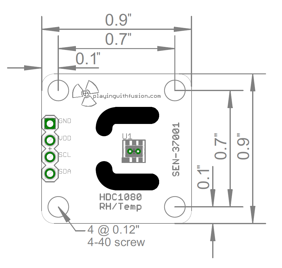 Breakout board for the Texas Instruments HDC1080. This sensor is an extremely accurate temperature and humidity sensing device, with +/-0.2C temperature and +/-2% humidity accuracy typical. These specs far exceed the accuracy of ICs that came before it, including the HTU2x and SHT2x series, and improves upon the success of the HDC1050. In addition, the HDC1080 has a wide input voltage range of 3V-5V and includes temperature and airflow cutouts as recommended for the best operation. Finally, in the case of environmental changes that could cause light condensation, the HDC1080 has a built-in heater to burn off any condensate. Example code (Arduino platform) is available below.
